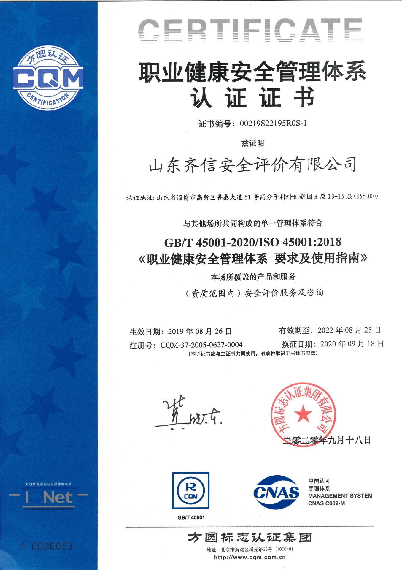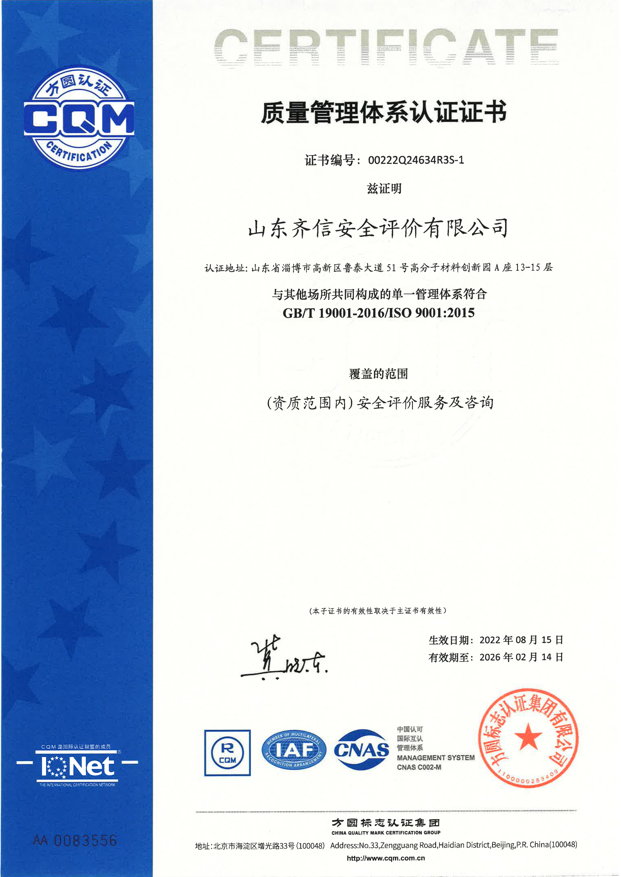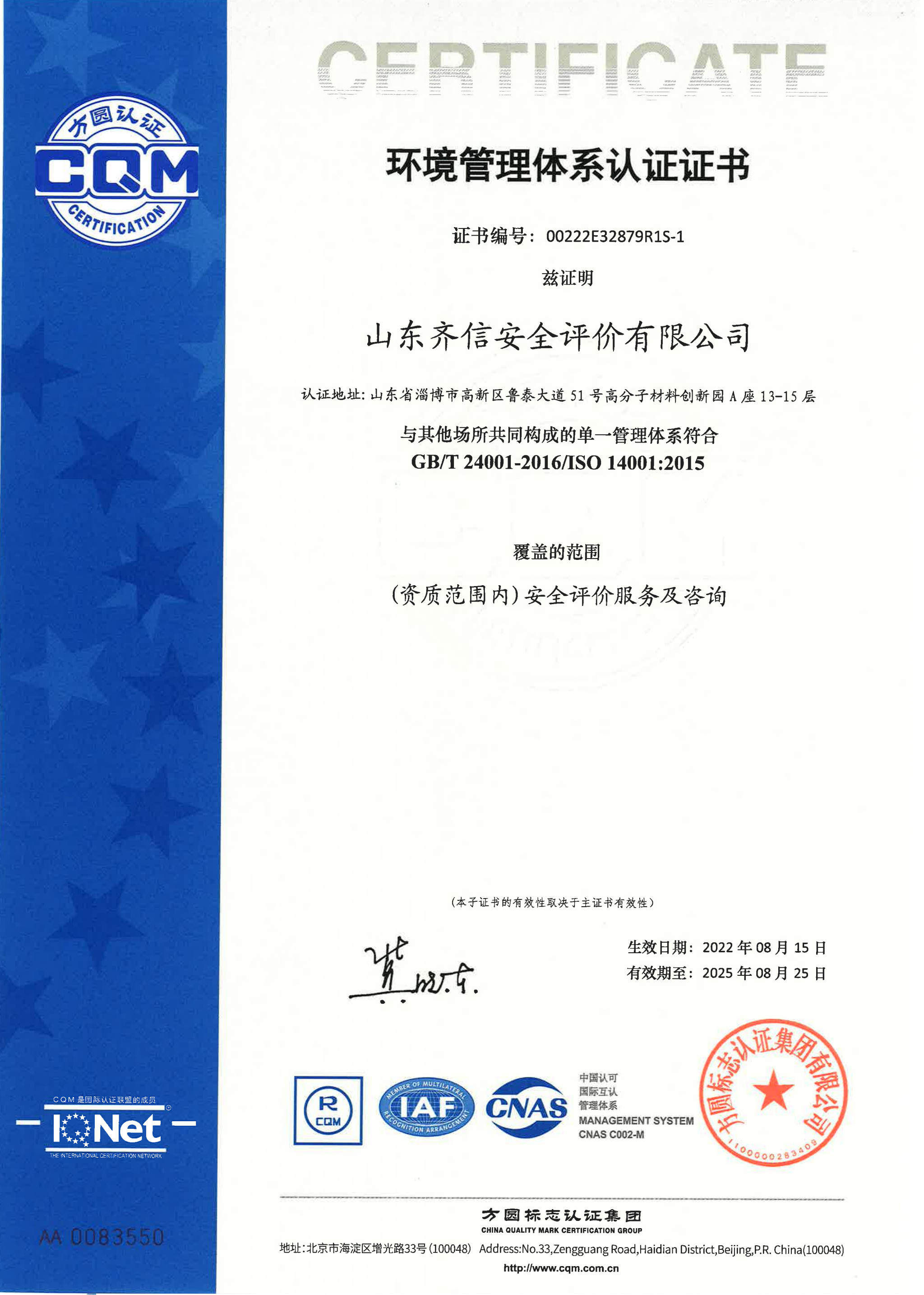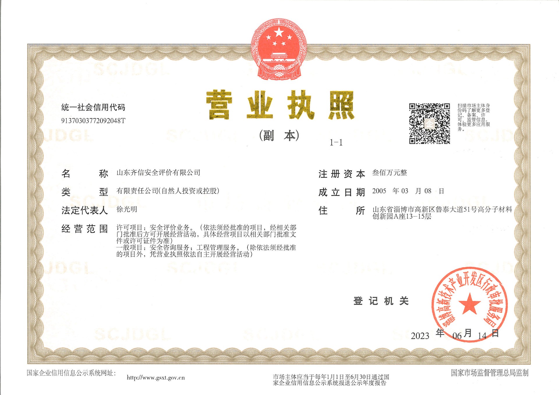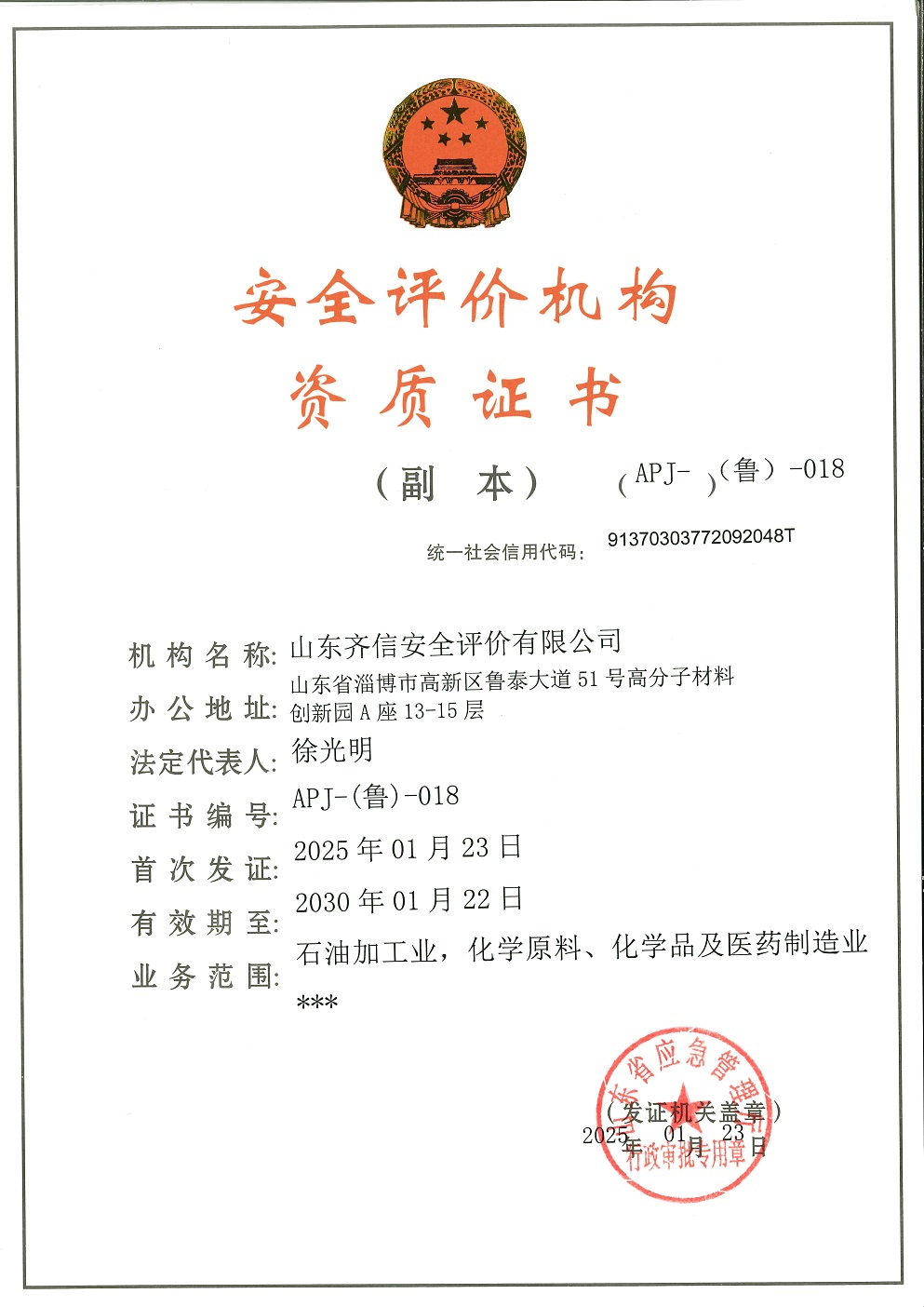 山東齊信安全評(píng)價(jià)有限公司成立于2005年3月,注冊(cè)資本300萬(wàn)元人民幣,固定資產(chǎn)總值804.8728萬(wàn)元。法定代表人徐光明,注冊(cè)地址及辦公地址位于淄博高新區(qū)魯泰大道51號(hào)高分子材料創(chuàng)新園A座13-15樓。2005年9月取得安全評(píng)價(jià)機(jī)構(gòu)乙級(jí)資質(zhì)。自國(guó)家應(yīng)急部1號(hào)令實(shí)施以來(lái),公司于2020年1月15日取得新安全評(píng)價(jià)資質(zhì),業(yè)務(wù)范圍包括:陸上油氣管道運(yùn)輸業(yè);石油加工業(yè),化學(xué)原料、化學(xué)品及醫(yī)藥制造業(yè);金屬冶煉。2018年12月21日取得安全生產(chǎn)標(biāo)準(zhǔn)化二級(jí)評(píng)審單位,評(píng)審范圍:危險(xiǎn)化學(xué)品、紡織、建材、輕工、冶金、機(jī)械。 公司現(xiàn)有人員41人,其中專職安全評(píng)價(jià)師37人,注冊(cè)安全工程師26人,研究員1人、碩士5人、雙學(xué)士1人,山東省安全專家?guī)鞂<?人、教授級(jí)高工1人,高級(jí)工程師8人、工程師22人,專職危險(xiǎn)化學(xué)品標(biāo)準(zhǔn)化評(píng)審員、工商貿(mào)標(biāo)準(zhǔn)化評(píng)審員30人,本科以上學(xué)